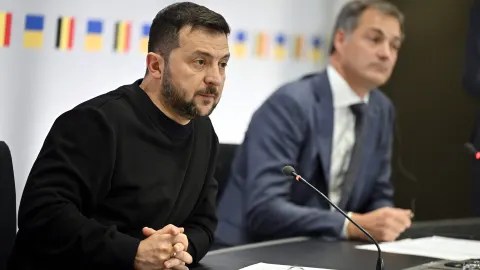 Ukraine president Volodymyr Zelensky and Belgian Prime Minister Alexander De Croo during a press conference following their meeting in Brussels on October 11, 2023.