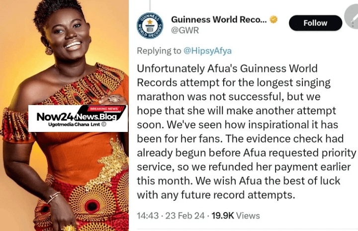 In a tweet on Friday, February 23, 2024, the official response read: “Unfortunately Afua’s GuinnessWorld Records attempt for the longest singing marathon was not successful, but we hope that she will make another attempt soon. We’ve seen how inspirational it has been for her fans. The evidence check had already begun before Afua requested priority service, so we refunded her payment earlier this month. We wish Afua the best of luck with any future record attempts.”